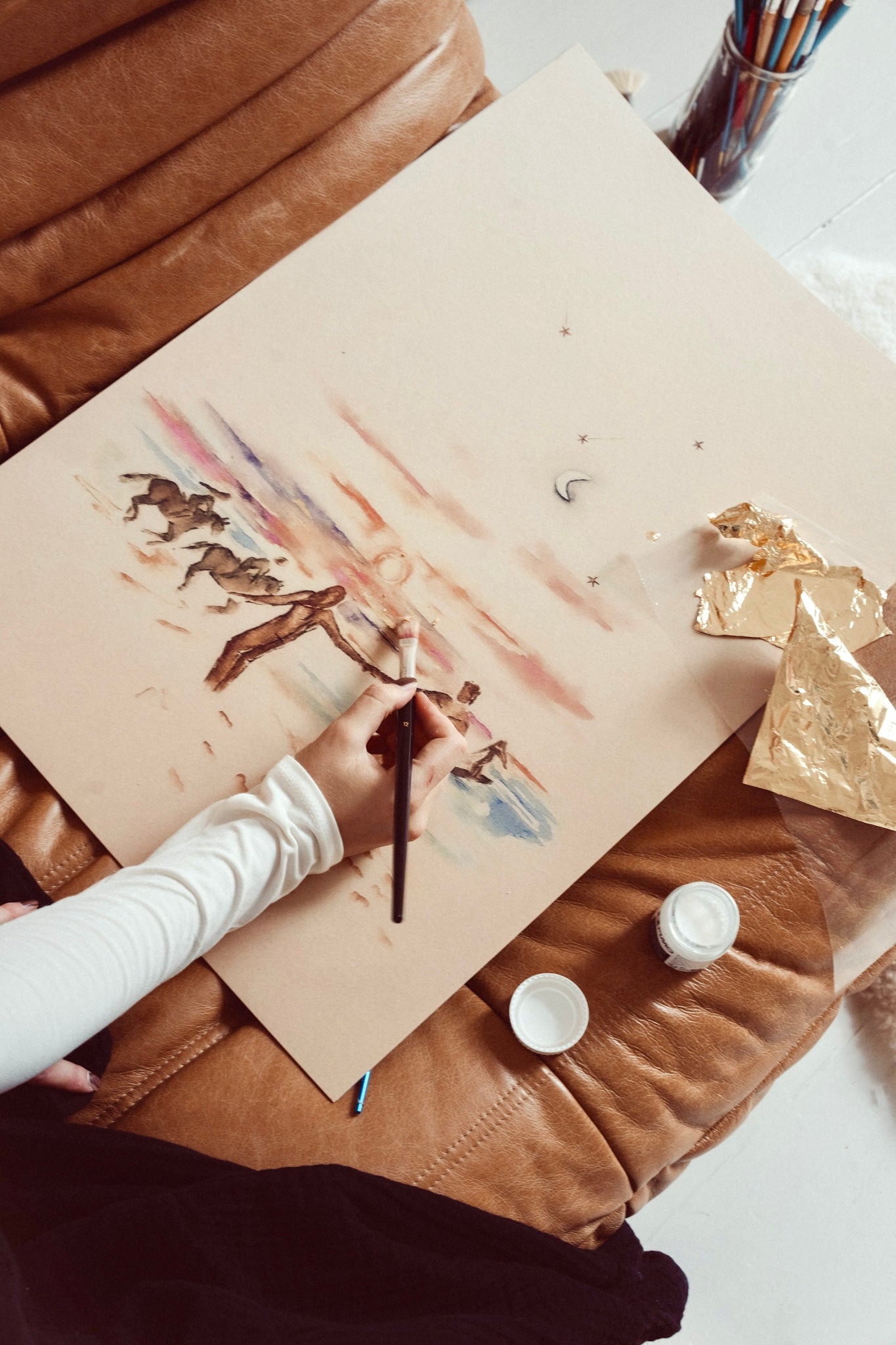 Als alles is besproken en het beeld helder is, begin ik met schilderen. Ik neem alles wat jij hebt verteld mee. De sfeer, de details, de emotie, en laat het samenkomen in één beeld. In mijn hoofd vormt zich een compositie die klopt, en op papier krijgt jouw verhaal een eigen plek. Jij hoeft nergens meer aan te denken: ik zorg ervoor dat jouw herinnering op een bijzondere manier tot leven komt. Dit wordt een kunstwerk dat voelt als thuiskomen.