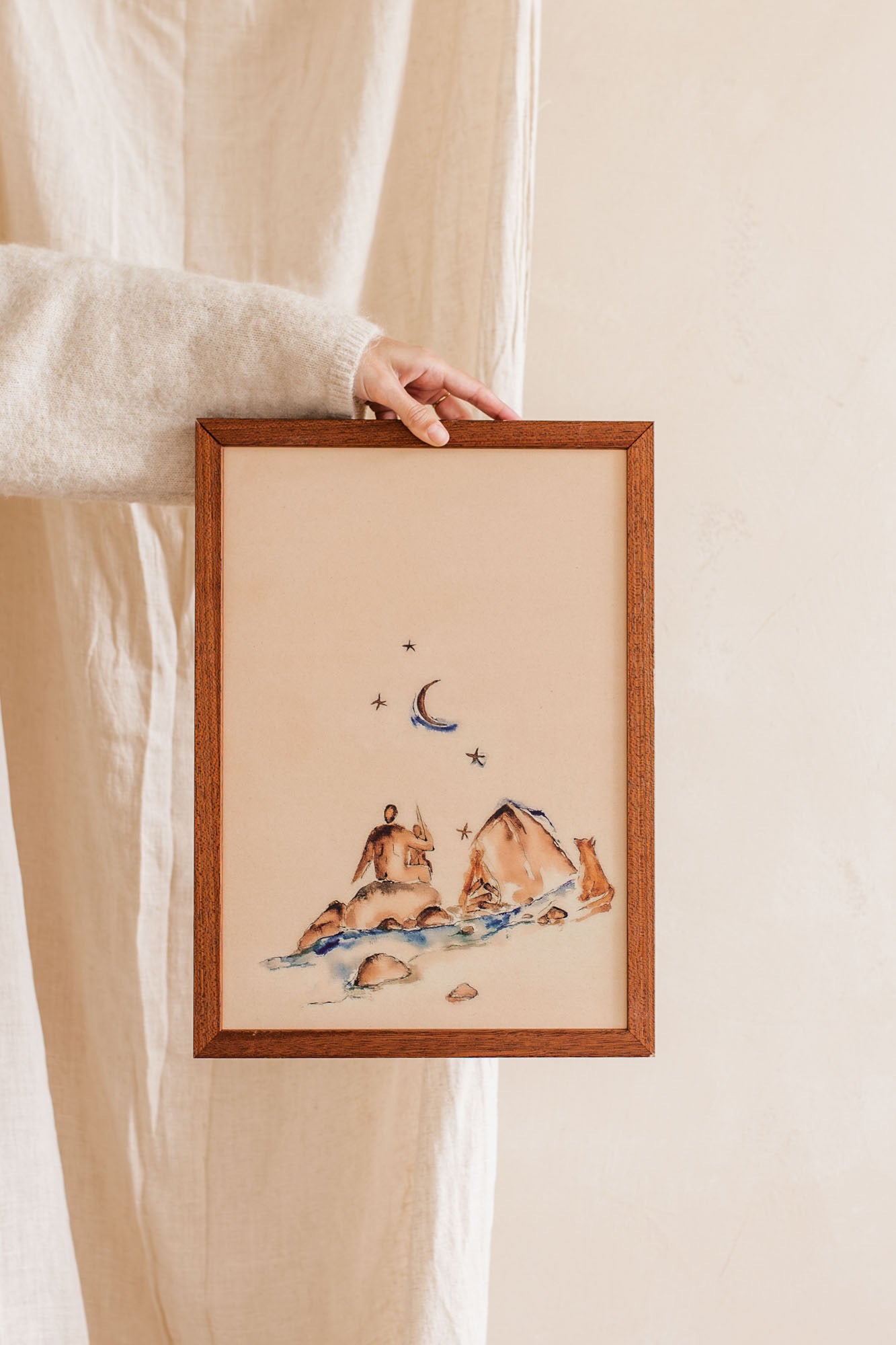 Vader met zijn zoontje op avontuur. Bij het tentje en het knetterde kampvuur kijkt een vosje om de hoek.